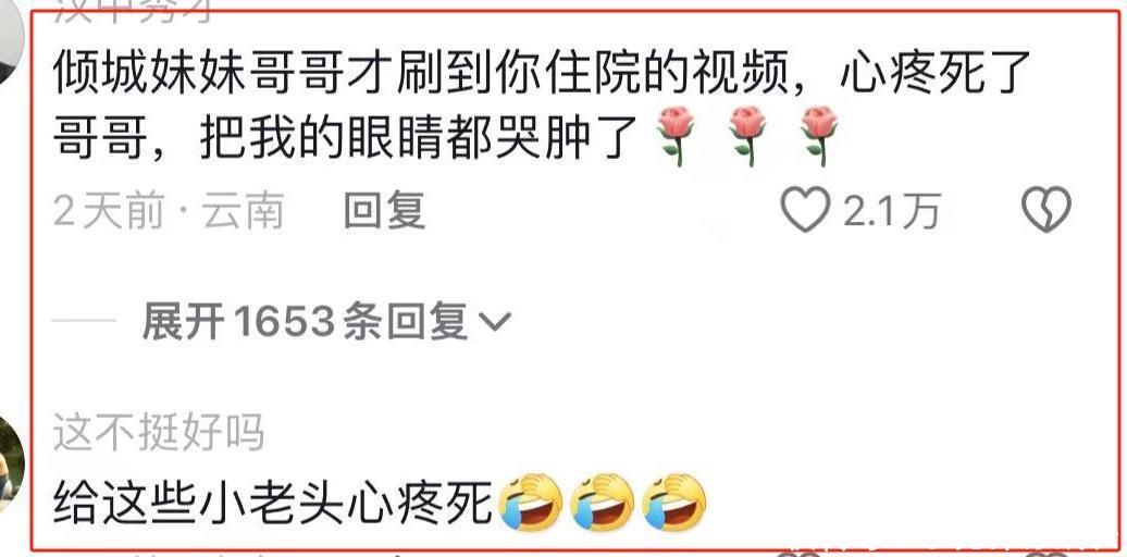 一位云南的粉丝说:“看到你入院的视频,哥哥怜爱死了,我的眼睛齐哭肿了。”